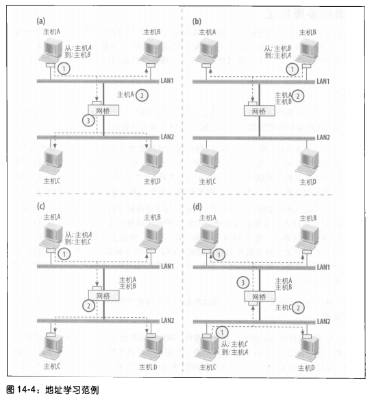 图 14‑1 (b) 展示了所谓的存储转发网桥(store‑and‑forward bridge),这也是 Linux 所采用的机制:以太网帧只有在完整接收完毕后,才会从对应端口转发出去。