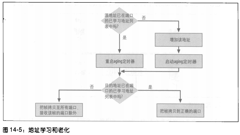 这种老化机制通常由一个简单的定时器实现:地址首次被学习时启动定时器;每当再次监听到该主机时,定时器就会重启(重置),以确认或更新其地址。该过程如图 14‑5 所示。