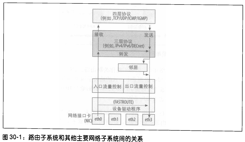 图 30-1 给出了网络协议栈中路由子系统的位置(灰色框)。