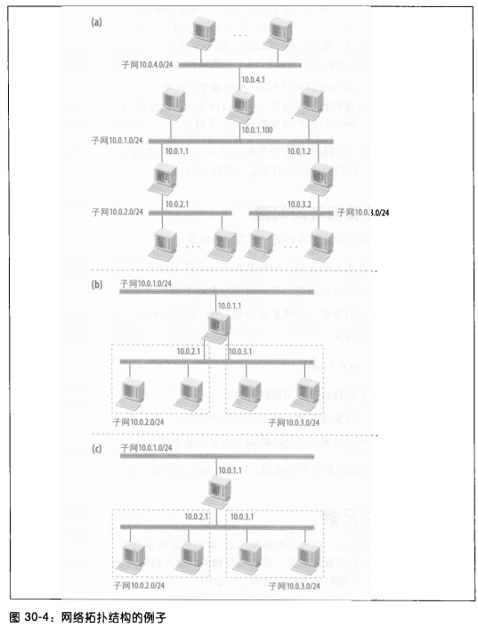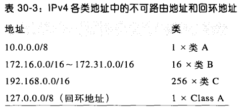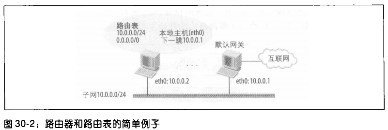 - 图 30‑2 展示了包含两条路由的路由表:一条通往本地子网 10.0.0.0/24,另一条通往其他所有网络。后者被称为默认路由(default route),在路由表中记为全零网络(参见 “默认网关选择” 一节)。
