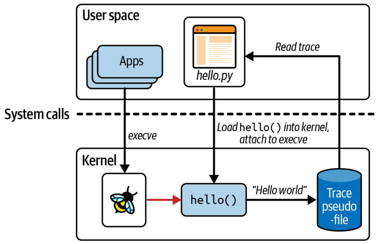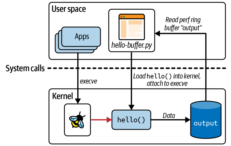 - user space code: 加载 eBPF 程序到内核中,并且读取其生成的跟踪信息