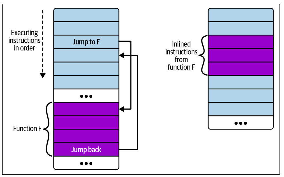 如图,右侧显示了内联函数时的情况:没有跳转指令;相反,在调用函数内直接包含函数的指令副本。